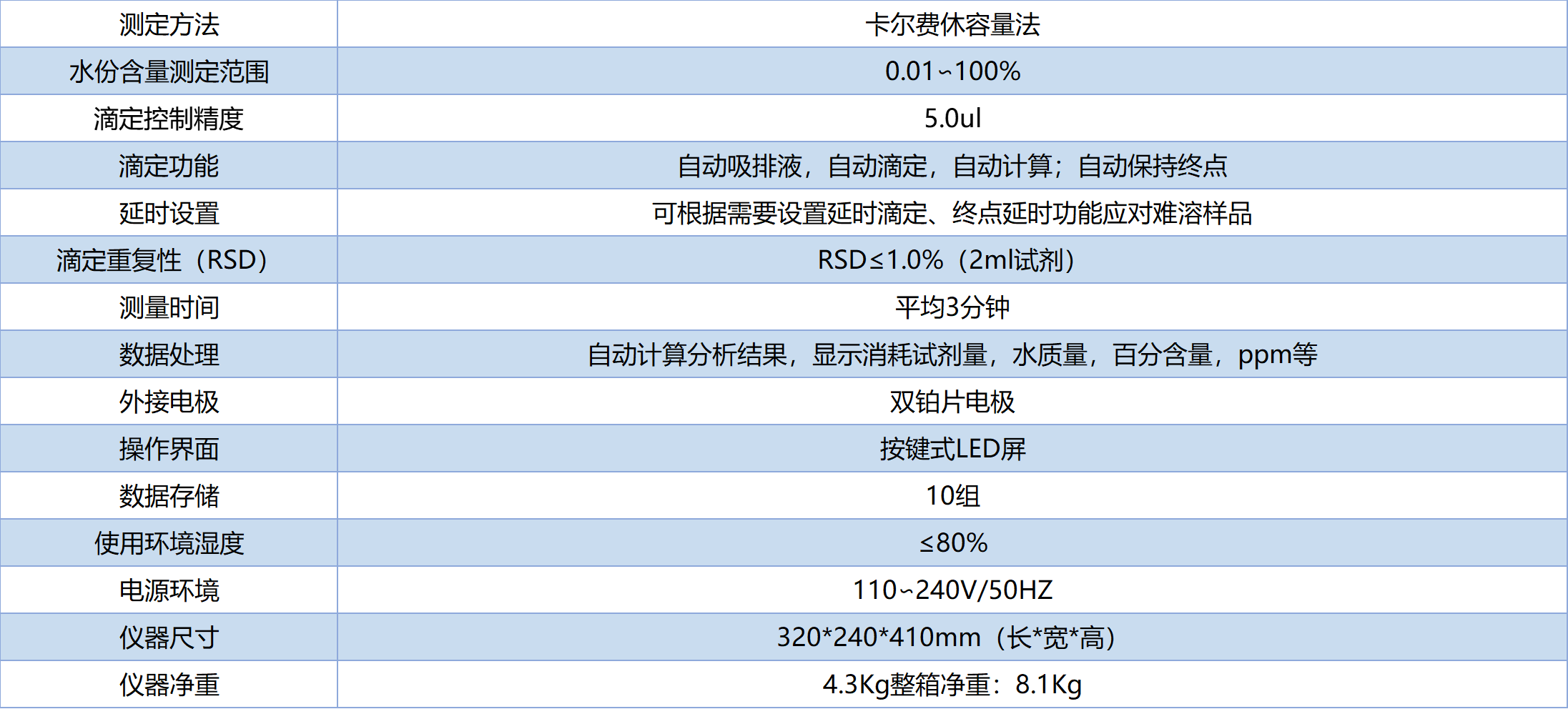 6、儀器多種結(jié)果同時顯示(水分含量、百分含量、卡氏試劑消耗量),滴定動態(tài)顯示,測量結(jié)果自動記憶;