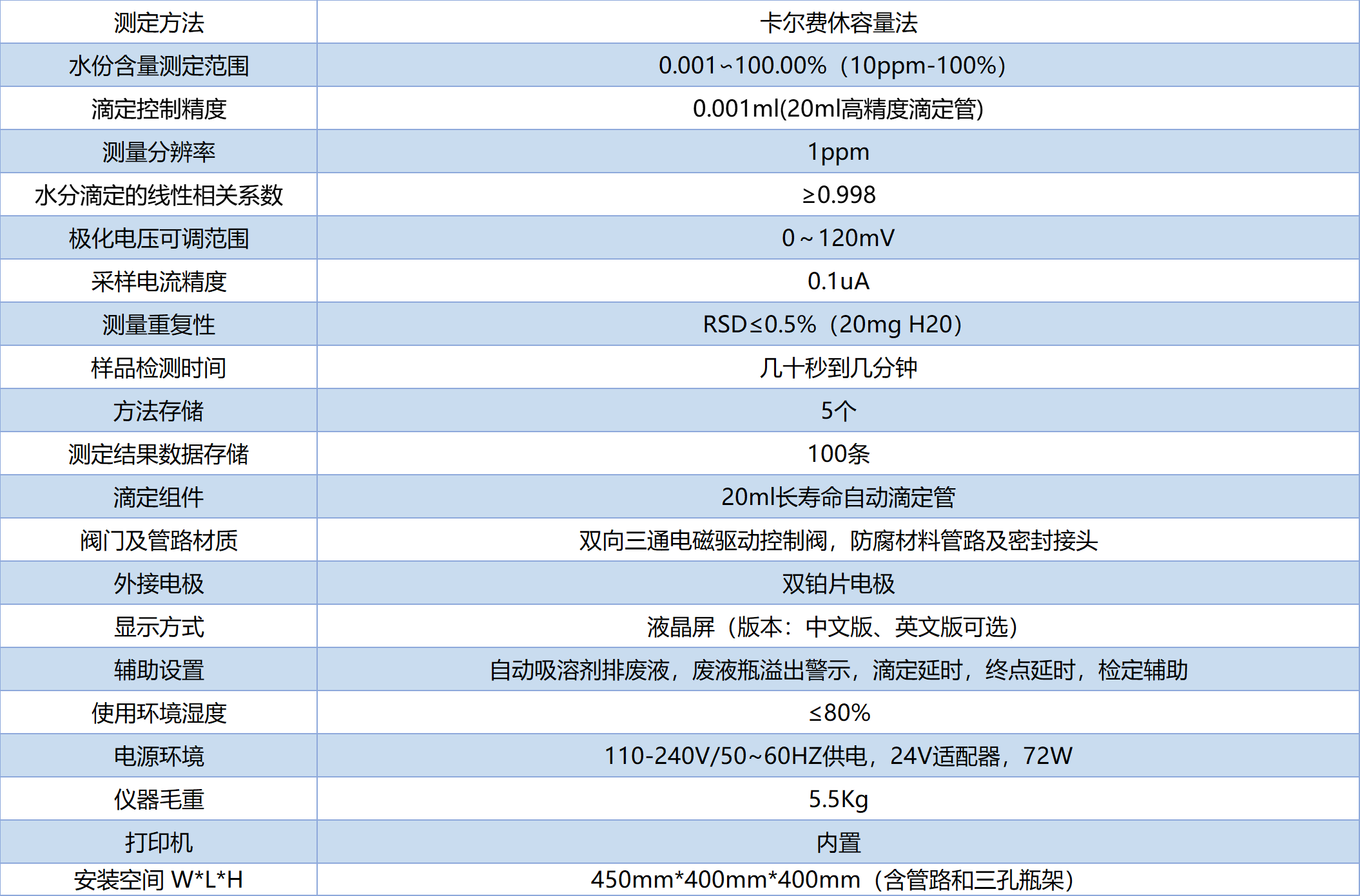 2、按鍵操作儀器可進行計量管清洗、定量饋液、吸溶劑、排廢液、自動滴定等功能;適用各品牌卡爾-費休試劑,實現(xiàn)自動更換溶劑和排出廢液。