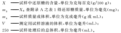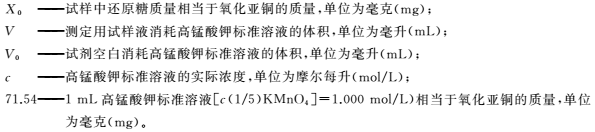 試樣經處理后,其中還原糖把銅鹽還原為氧化亞銅,加硫酸鐵后,氧化亞銅被氧化為銅鹽,通過高錳酸鉀標準滴定溶液的氧化作用后生成的亞鐵鹽,根據高錳酸鉀標準滴定溶液的消耗量,計算氧化亞銅的含量,再查表得還原糖量。