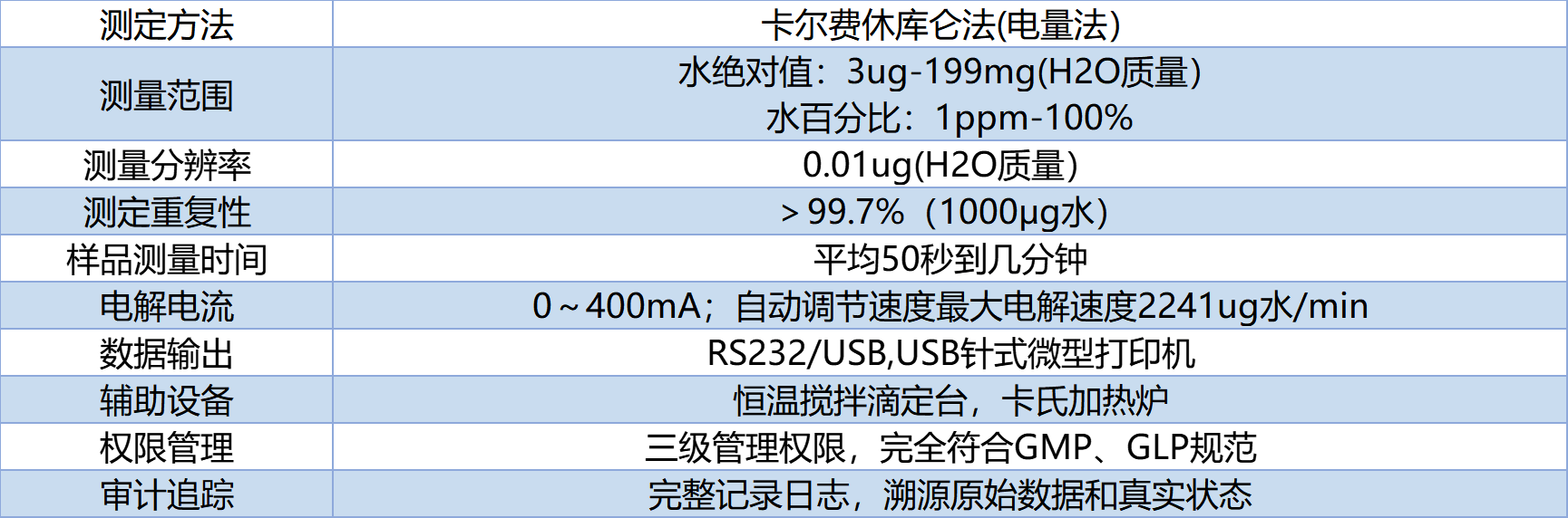高精度 精度0.01ug,測(cè)試范圍0.001%-100%含水量 |